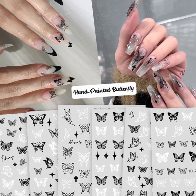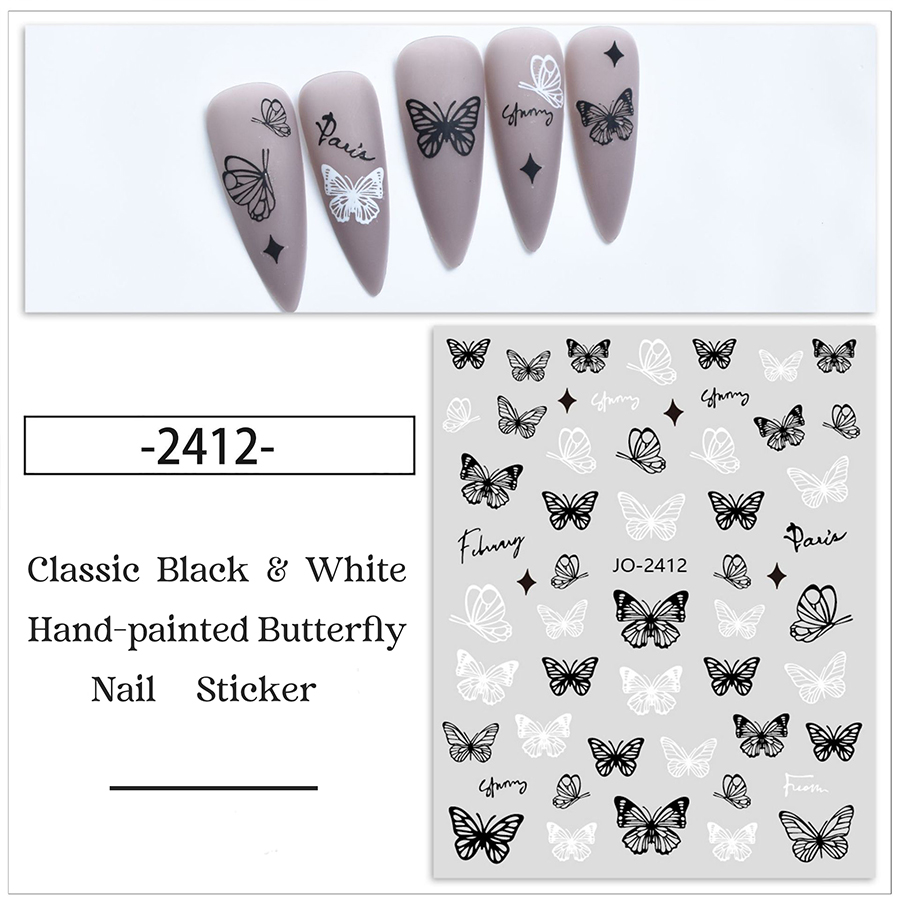 JO2412-2417 Classic Black &White Hand-painted Butterfly Nail Sticker
