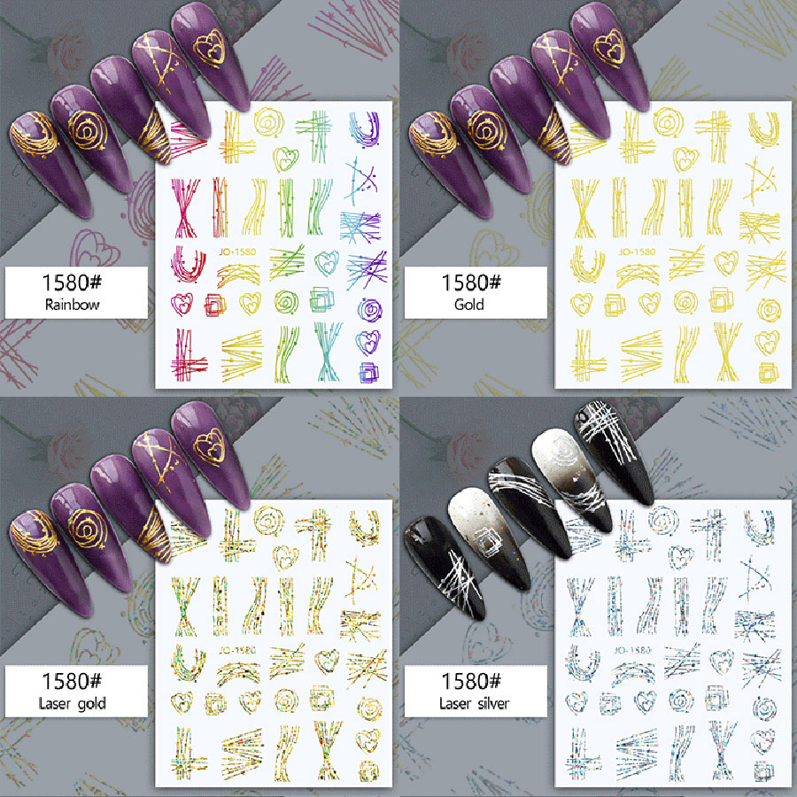 JO1574-1585 Gilded Laser Nail Sticker, 48 designs avialable.MOQ per design is 20pcs.please kindly choose the design number(s) when you order.